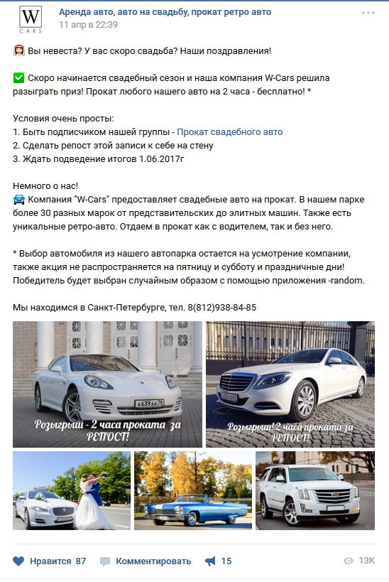 Приглашаем всех принять участие в нашем новом конкурсе, который проводиться в нашей группе ВКОНТАКТЕ. Навигация по записям Previous PostОткрытие сайта W-carsNext Post Итоги конкурса 2 часа аренды авто Бесплатно!