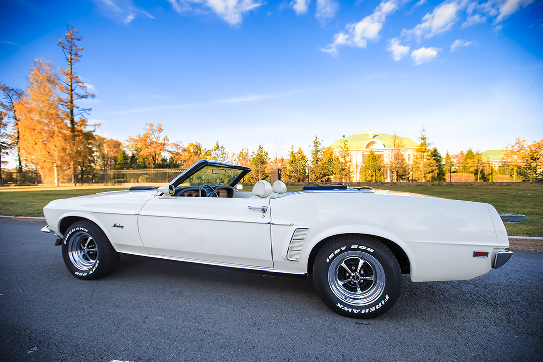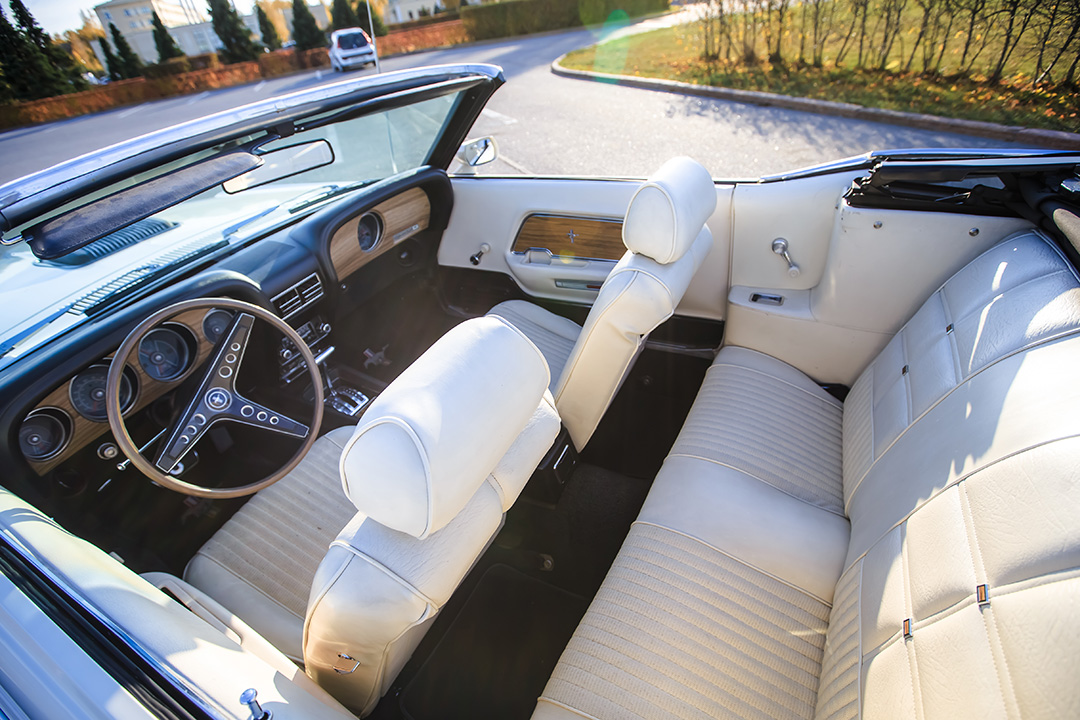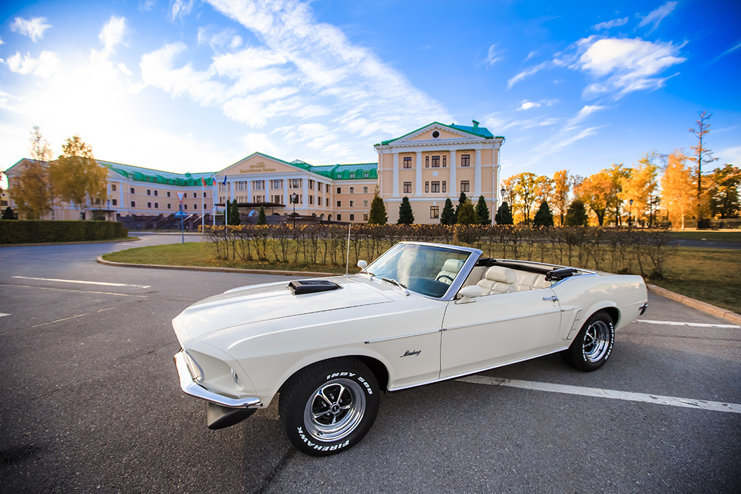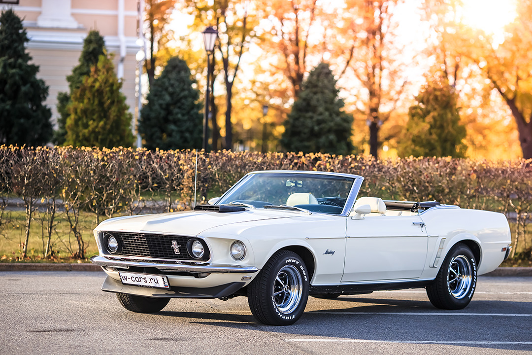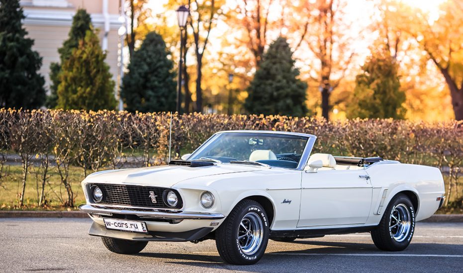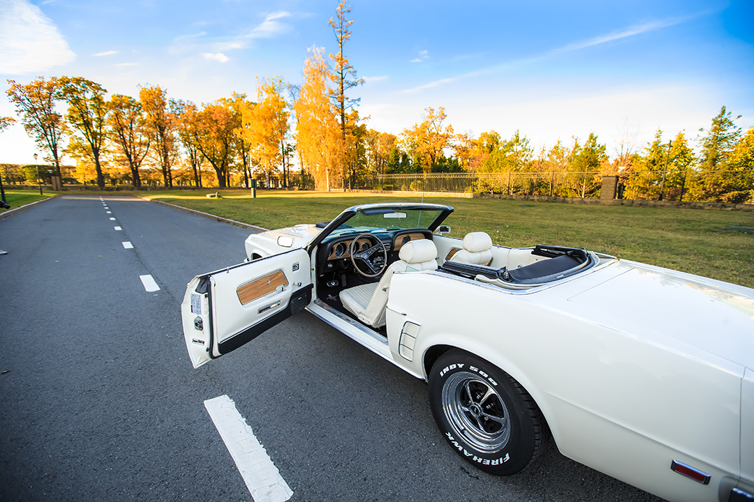 Интерьер выполнен из белой кожи и рассчитан на комфортное размещение до 3 персон. Салон отличается стильным ретро-оформлением с характерными для эпохи аналоговыми приборами и эргономичными сиденьями. Аренда авто в W-cars гарантирует получение полностью отреставрированного и технически исправного Ford Mustang с услугами профессионального водителя для ваших торжественных событий.